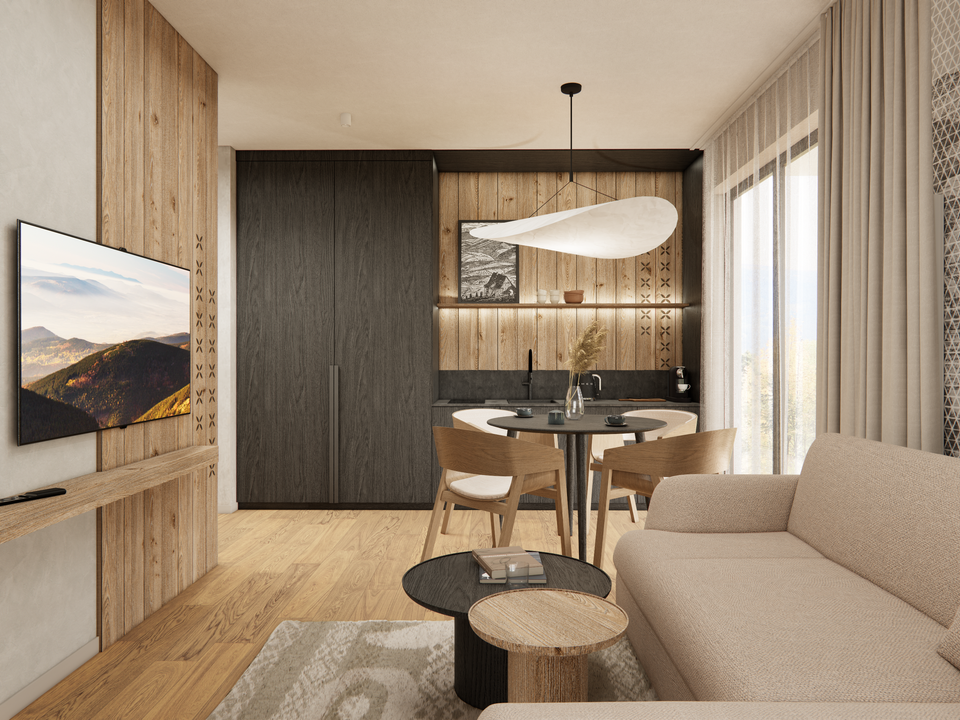 To tutaj, w otoczeniu gór, Goście będą mogli się zrelaksować i komfortowo podziwiać piękno przyrody z własnego balkonu lub tarasu. Każdy apartament dwupokojowy został wyposażony w funkcjonalny aneks kuchenny oraz przestronną łazienkę z możliwością instalacji prywatnej sauny. Istnieje także możliwość montażu klimatyzacji, co dodatkowo podnosi standard pobytu.